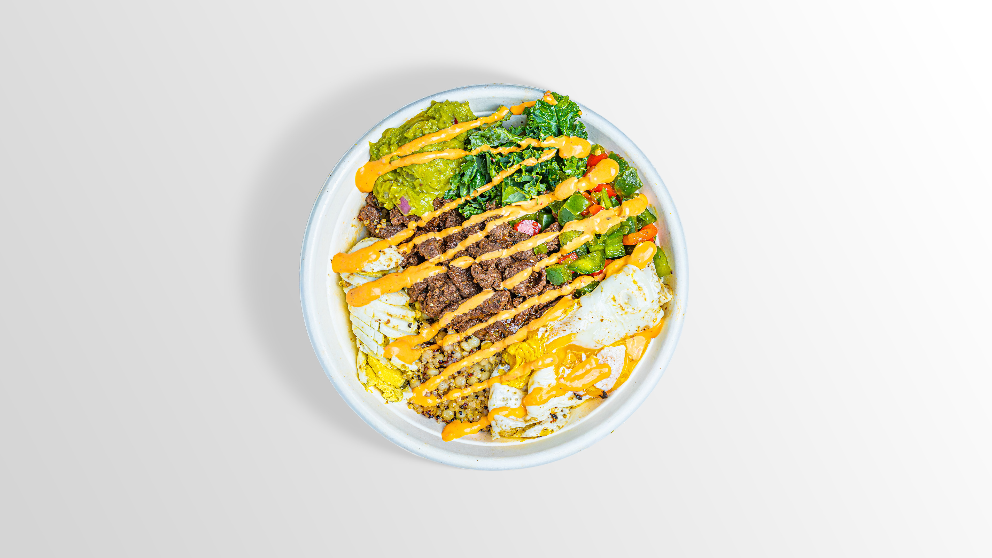 Quinoa/Couscous, Two Eggs (Fried or Boiled), Steak, Kale, Sweet Pepper, Guac, Chipotle Ranch
