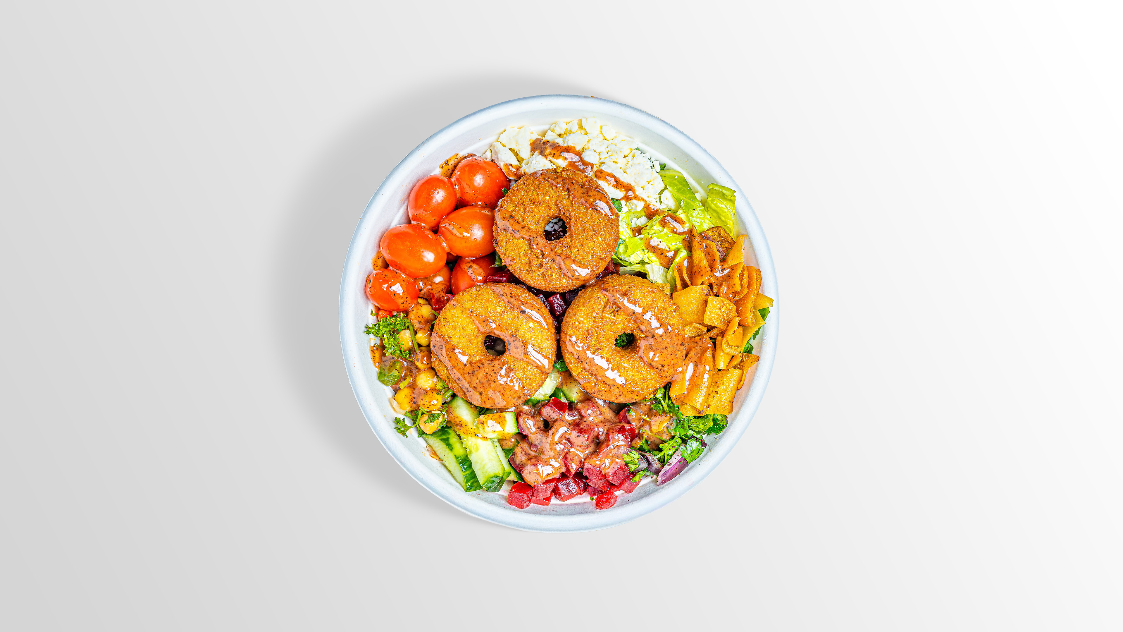 Pesto Hummus, Falafel, Romaine Lettuce, Kale, Chickpea Salad, Onion Parsley Salad, Cucumber, Tomato, Beets, Feta Cheese, Pita Chips, Lemon Herb Vinaigrette