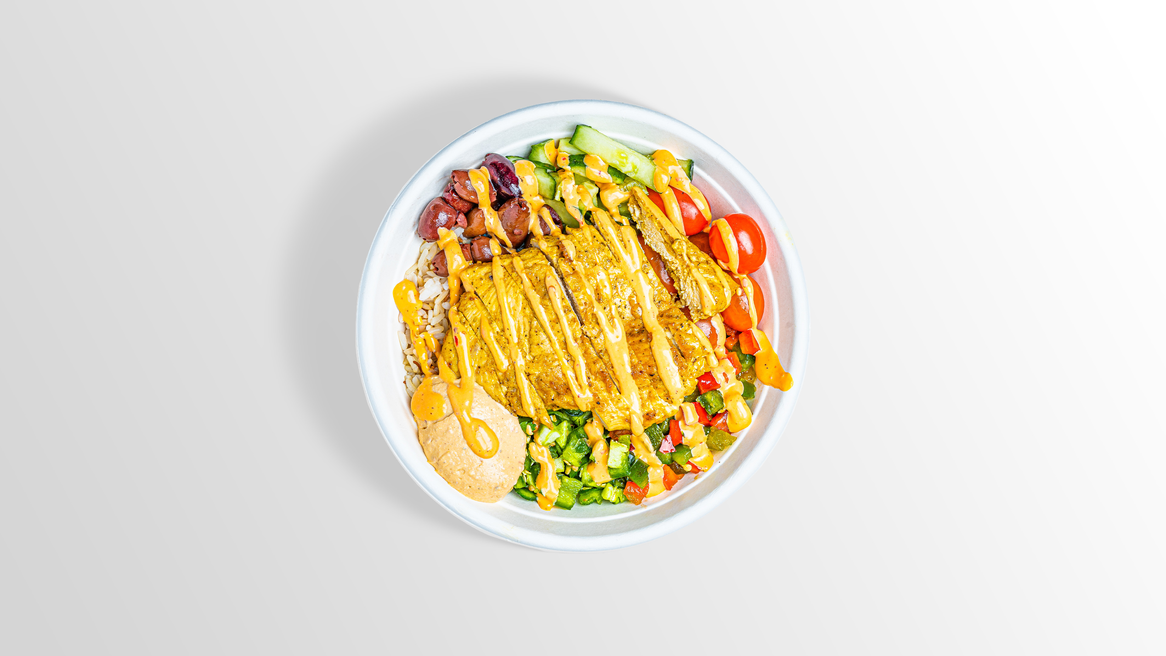 Spicy Hummus, White Rice, Jalapenos, Sweet Pepper, Romaine Lettuce, Cucumber, Tomato, Kalamata Olives, Chipotle Ranch